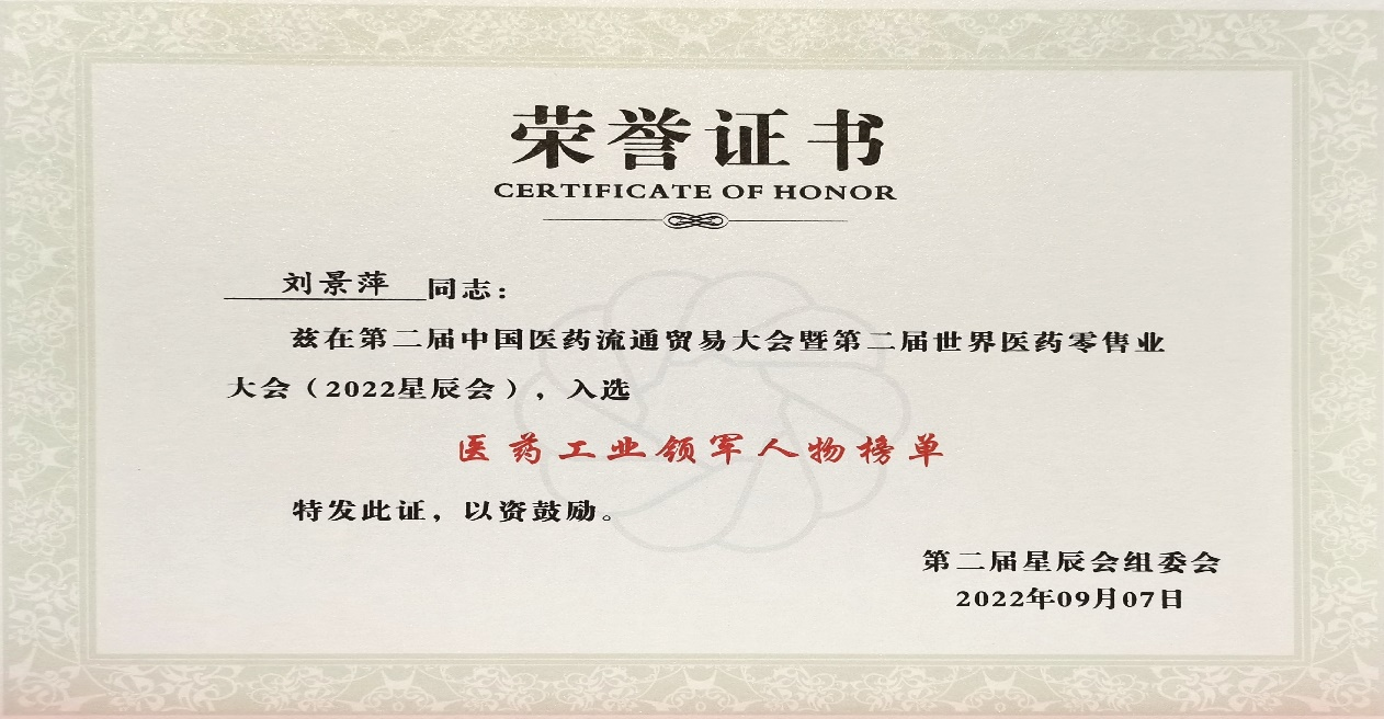 本次星辰会期间,人生就是搏斩获颇丰,获得多项行业奖项及荣誉。在开幕式上,刘景萍董事长荣获“医药工业领军人物”称号。